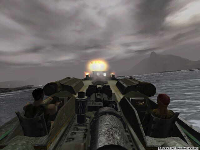 Now the actual controls of the game work well most of the time, but can often be very frustrating. For instance, try backpedaling during a fire fight and don't be surprised if you almost lose your ship trying to get realigned with the action. Going in reverse is just handled strangely, pulling it off correctly is often a hit or miss procedure. Another thing that can get in the way quite often is the shock wave that the water gives off when you blow something up. If you happen to be going at a decent speed and run into a shock wave as it happens, your boat will fly into the air for what seems like minutes, all the while as the enemies take pot shots at you in the air. Likewise, your boat has the same 'floaty' feel when going off any normal jump or big wave. Other than those irks, the gameplay works effectively, the control set up works easily and moving about is usually simple and fun, and definitely feels like you're cruising around on water.