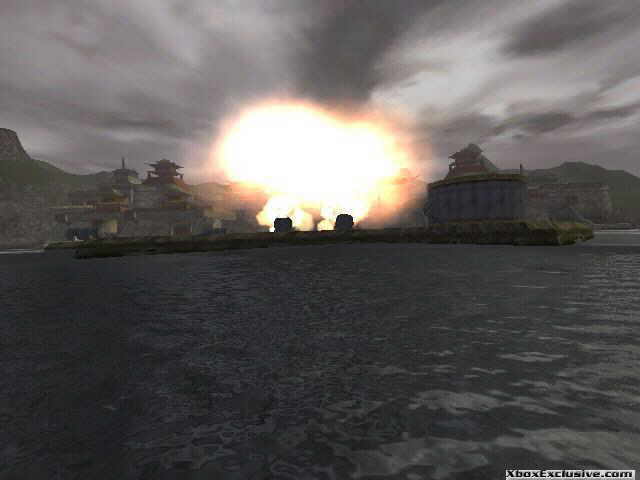 Now given Blood Wake takes place completely in huge oceanic levels, a huge part of the graphics come in the form of the water's physics and their use throughout the game. Most of the time, the water in the game is used to excellent effect, it animates beautifully and always gives off some really brilliant lighting and shimmering effects. The physics are also quite dynamic, you'll see the water produce shock waves upon blowing up an enemy, and leave a very nice trail behind your ship as you speed ahead. The water looks especially nice during stormy whether conditions. All in all, the water works very nicely for the game. The castles and cities also look nice, and you can always see very far into the horizon. Some things don't fare as well though, the rock structures and grass on hills look pretty dull, and the menus in the game are fairly lackluster. The pictures that forward the story are also not too impressive (much like the ones in Soul Calibur).