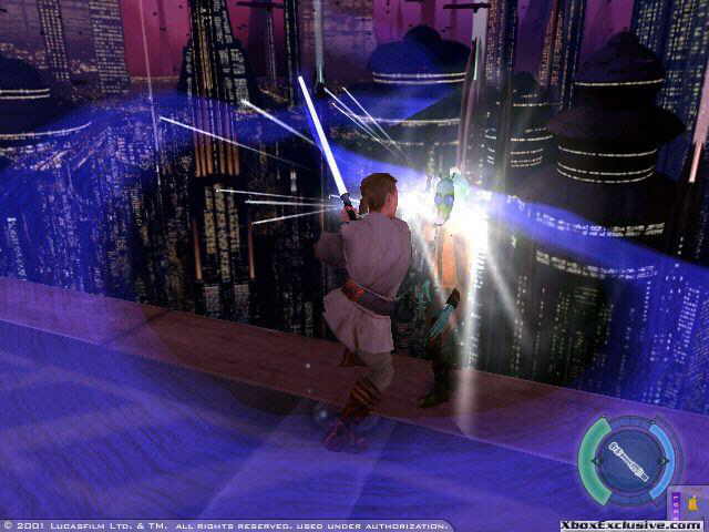 I'll be frank with you - models and textures look pretty bad up close in Obi Wan. Imagine a game with models that have the poly count and texture quality of a Dreamcast game, coupled with the special effects of an XBOX game. That's pretty much where the graphics stand. Odds are you will probably laugh at or be scared by the terrible facial features of characters in this game (Yoda is especially dreadful). To add to the ugliness, the far off backgrounds are often static 2Dish pictures, sometimes with a bar of tiny moving 2D blobs that are supposed to look like ships moving in the background; this "trick" doesn't look so hot on TVs bigger than 36". To top it off, the game's framerate drops below 30fps very often. It's not enough slowdown to affect gameplay, but it just looks bad, especially with the already poor looking graphics. Lighting and shadows on Obiwan look strange and unnatural as well. Not to mention that enemies don't cast a shadow, but you do. Expect some clipping here and there as well. On the bright side, There are some nice lighting effects produced by Obi's light saber. Plus, when you slice up droids, they will break apart based on how you hit them.