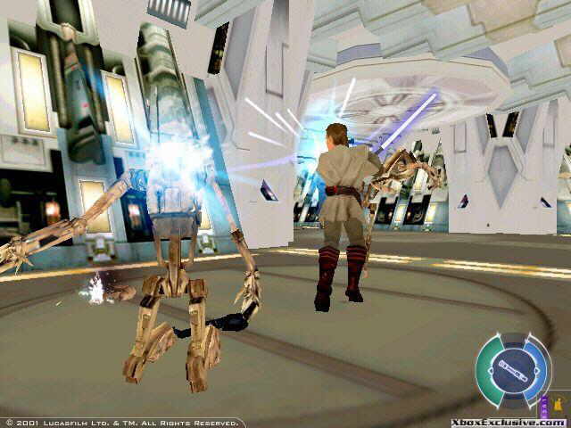 If you haven't been scared off yet, this is where Obi Wan shines. The game is very simply fun as hell to play. Having all sorts of Force powers at your disposal, along with a great lightsaber battle system, lends this game to be one of the best game playing experiences for Star Wars fans. For those who want juicy details, Obi Wan is a 3rd-person style game that looks similar to Tomb Raider. The force powers in Obi Wan include the following: Force Jump, Force Pull, Force Push, Force Throw, Force View, Force Lightsaber Throw, and Force Lightsaber Attacks. Force Jump allows you to jump much higher. Force Pull allows you to disarm enemies with guns, though most enemies have a backup melee weapon. Force Push allows you to knock enemies back or push them off cliffs, Force Throw catapults nearby objects, such as rocks, onto enemies, Force View slows down time ala Matrix (which can be helpful when you get swarmed), Force Lightsaber Throw allows you to throw you lightsaber clear across the room and back (all the while spinning around like a deadly boomerang), while Force Lightsaber Attacks greatly increase the damage your Lightsaber inflicts. While all these powers may seem impossible to execute with just a controller, it is actually done quite well with the Left Trigger functioning as a Force Power toggle. To pull off any of the Force moves you simply hold down the left trigger and push the corresponding face button on the controller. Lightsaber combat in Obi Wan is accomplished by moving around the right thumbstick; the way Obi Wan swings his Lightsaber corresponds to the way you move the right thumbstick. You can also pull off entertaining cartwheels and forward rolls by hitting one of the face buttons, which is always fun if you get tired of killing and just want to dance around a bit. Moving on, Obi Wan sports a 2-player splitscreen Lightsaber battle mode, which is actually quite good if you have a friend who also enjoys Star Wars. Load times for Obi Wan are pretty dismal, with a brisk minute-plus loadtime every time Obi Wan needs to dump to the hard drive; this usually happens the first time you play, and will often happen if you played a lot of other hard-drive intensive games (i.e. Halo, Dead or Alive 3) in between sessions of Obi wan. During this huge load time you are forced to watch a pixelated Star Wars scroller. If you play Obi Wan frequently, you will likely only get this scroller once. However, every time you play there is still a good 10 second load time in between levels despite the large amount of data copied to the hard drive. All in all though, it's worth the wait.