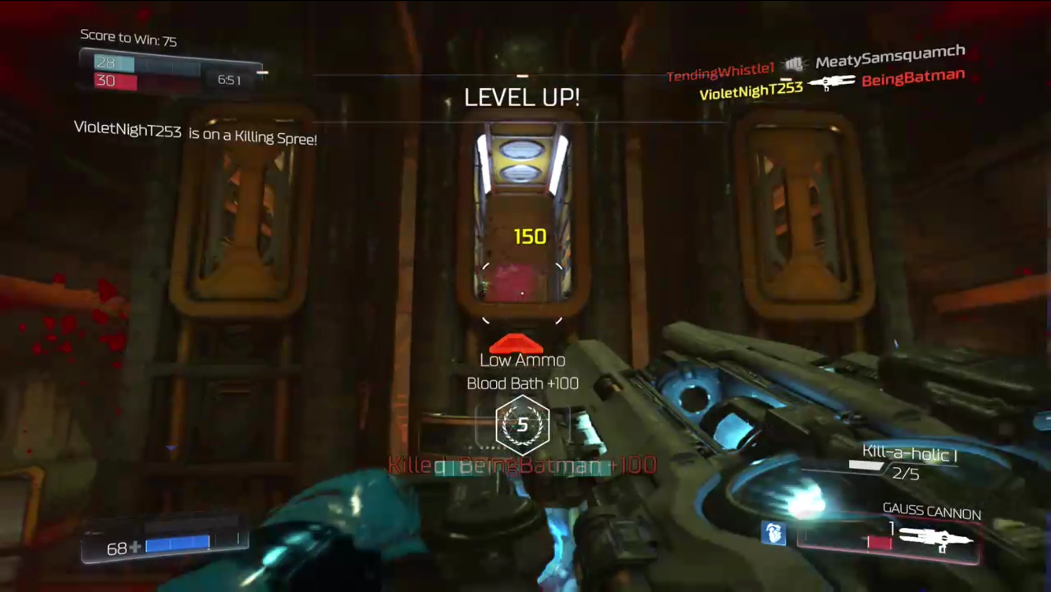 Outside of matches, the customization options are vast, and probably even more expansive in the final title. The beta let us change our armor, it’s colour, the colour and patterns of our weapons down to each piece, our taunts mapped to the d-pad, our loadouts, and controls (The default puts weapon switching to the right bumper for some ungodly reason, but that can be easily switched to the classic COD (Actually I know why, because rb is closer to the trigger, so you can switch faster, but it’s still a seemingly unnecessary learning curve))(Sorry about the brackets). After applying colour, you could even change how dirty and faded it all seems. Leveling up, even in the beta, was quick to unlock a bevy of new taunts and colours and armour pieces in excess of what even I could have hoped. And on top of all that, every match you earned new booster cards, like in Titanfall, to give temporary boosts to your next match. It’s as if the Doom people sat back for a decade watching what all the other shooters were doing, and then taking a little of the best pieces of each one.